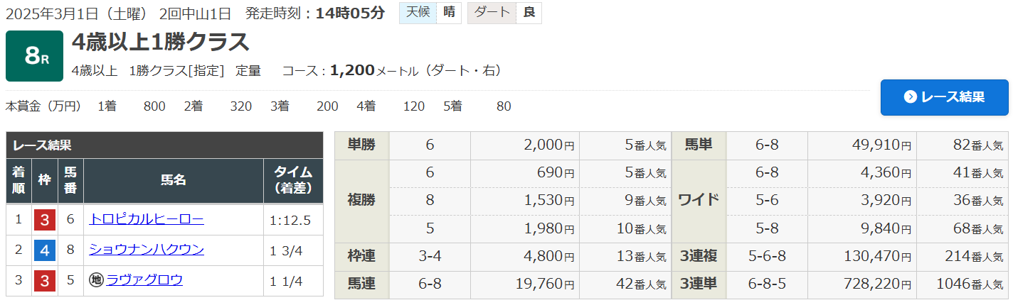 中山8R(4歳以上・1勝クラス)(ダート1200ⅿ)で的中!