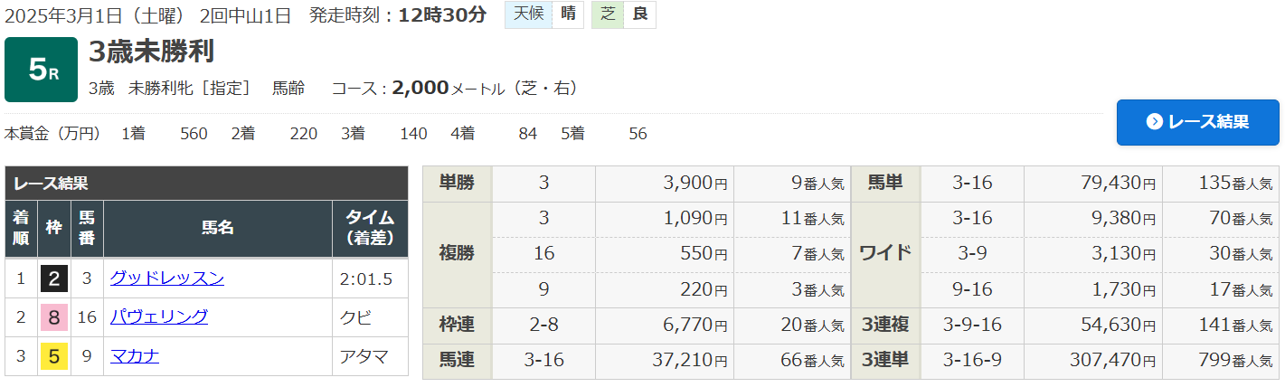 中山5R(3歳以上・未勝利クラス)(芝2000ⅿ)で的中!