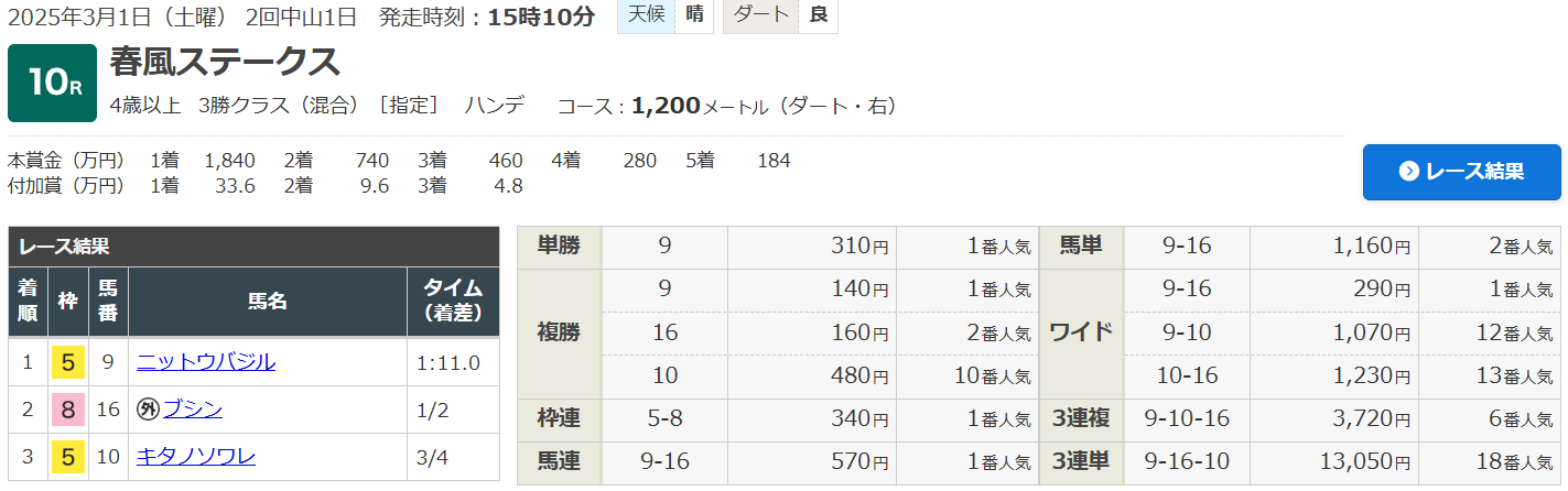 中山10R《春風S》(4歳以上・3勝クラス)(ダート1200ⅿ)で的中!