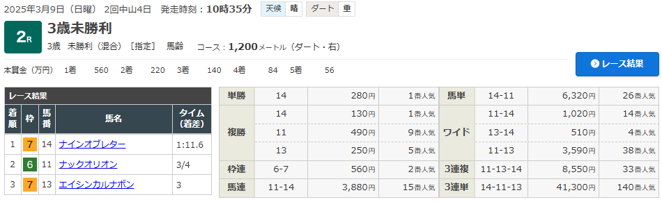 今回1着だったナインオブレターは、1番人気だったので間違いなく買いやすい馬券でした。