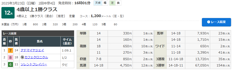 3/23 中京 12R(4歳・1勝クラス)(芝1200m)で的中!