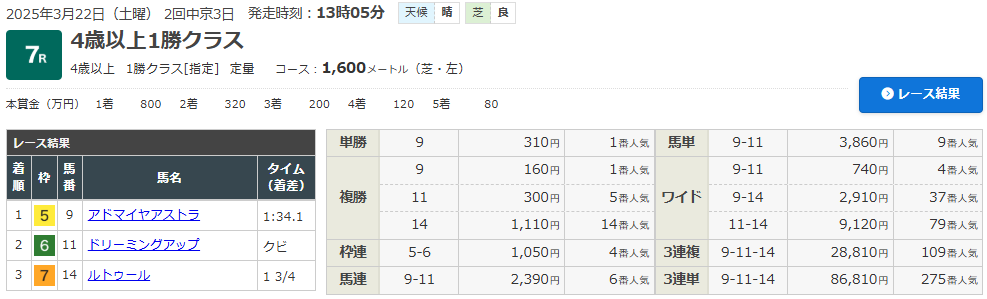 3/22 中京 7R(4歳・1勝クラス)(芝1600m)で的中!