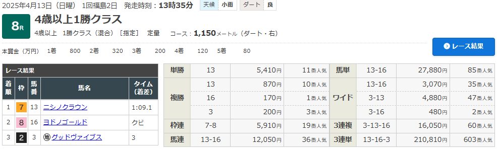 4/13 福島8R(4歳以上・1勝クラス)(ダート1150m)で的中!