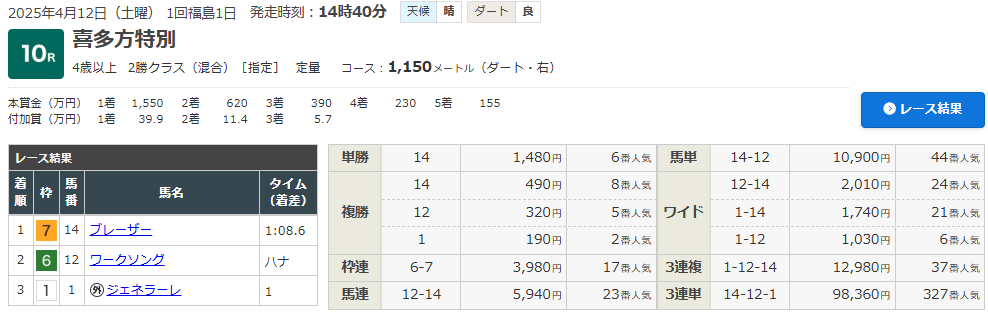4/12 福島10R 喜多方特別(4歳以上・2勝クラス)(ダート1150m)で的中!