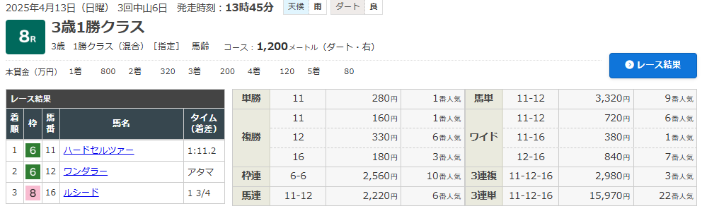 4/13 中山8R(3歳・1勝クラス)(ダート1200m)で的中!