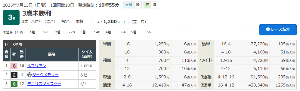 7/13 函館3R (3歳・未勝利クラス)(芝1200m)で的中!