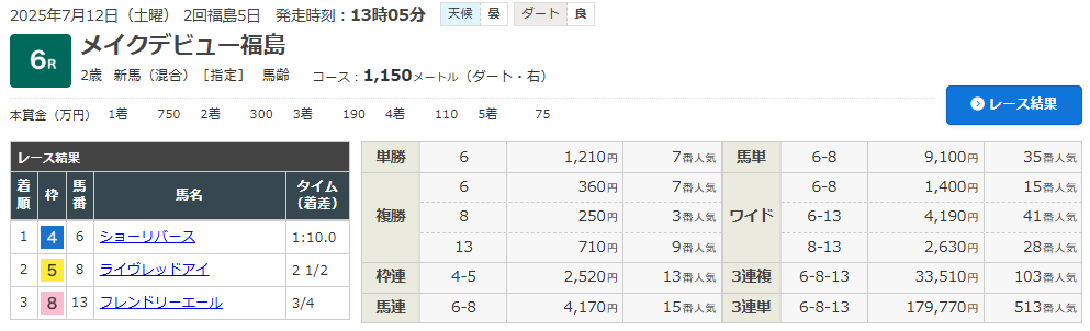 7/12 福島6R (2歳・新馬クラス)(ダート1150m)で的中!