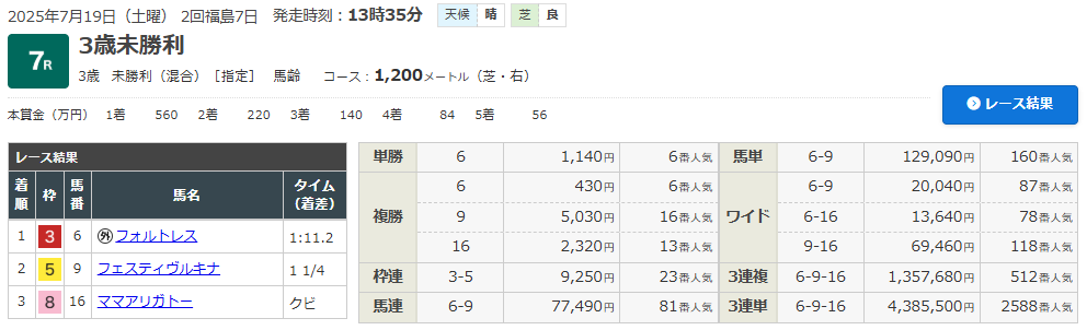 7/19 福島7R (3歳・未勝利クラス)(芝1200m)で的中!