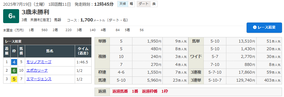 7/19 函館6R (3歳・未勝利クラス)(ダート1700m)で的中!