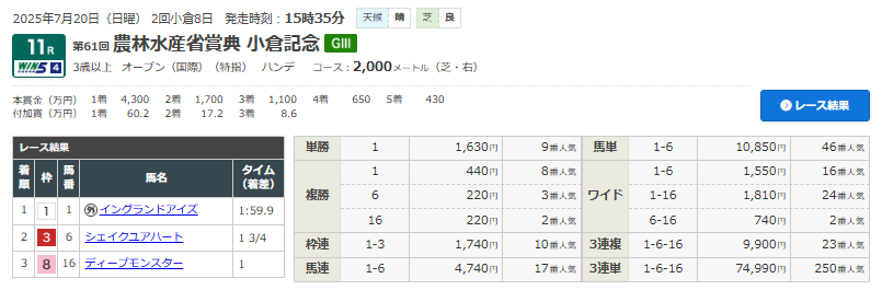 7/20 小倉11R 第61回農林水産省賞典小倉記念(3歳以上・オープンクラス・G3)(芝2000m)で的中!