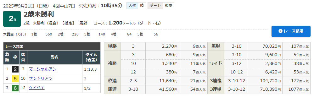 9/21 中山2R (2歳・未勝利クラス)(ダート1200m)で的中!