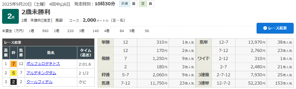 9/20 中山2R (2歳・未勝利クラス)(ダート2000m)で的中!