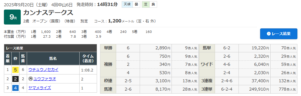9/20 中山9R カンナS (2歳・オープンクラス)(芝1200m)で的中!