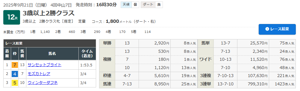 9/21 中山12R (3歳以上・2勝クラス)(ダート1800m)で的中!