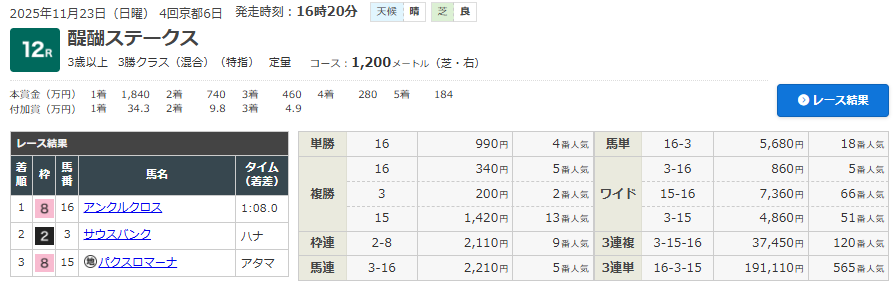 11/23 京都12R 醍醐S(3歳以上・3勝クラス)(芝1200m)で的中!