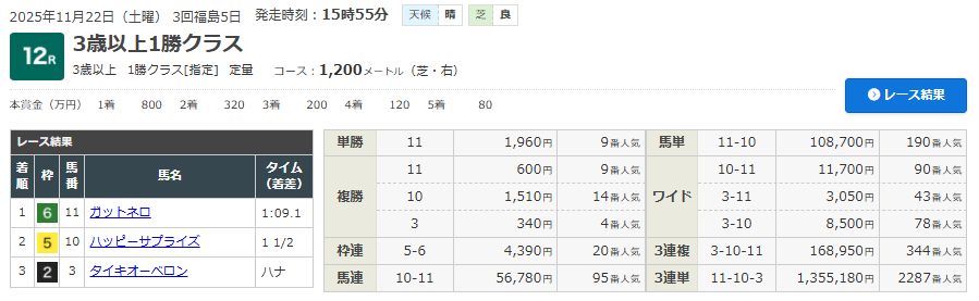 11/22 福島12R(3歳以上・1勝クラス)(芝1200m)で的中!