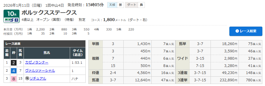 1/11 中山10R ポルックスS(4歳・オープンクラス)(ダート1800m)で的中!
