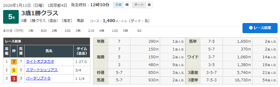 1/11 京都5R(3歳・1勝クラス)(ダート1400m)で的中!